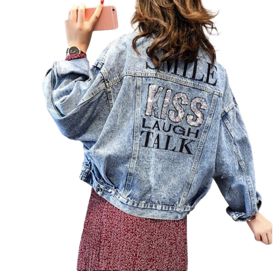 Bat-sleeve Lettering Sequins Loose Denim Jacket
